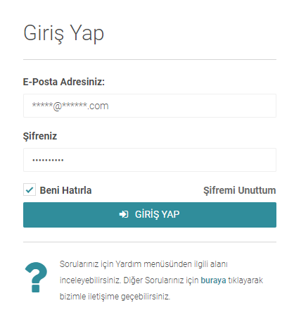 - Sistem tarafından "E-mail" adresinize gönderilen “Şifre” 'nizle ana sayfada bulunan giriş bölümünden sistemimize giriş yapabilirsiniz.