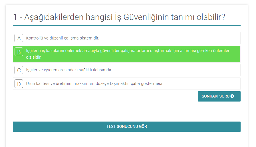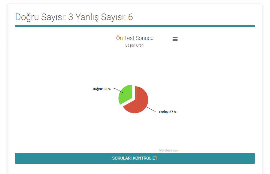 Testi bitirdikten sonra soruların doğru cevapları yeşil işaretlenmiş yanlış olanlarda kırmızı işaretlenmiş şekilde karşımıza çıkıyor .